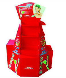Un banco di mostra quattro dei lati di POP rosso del cartone per la promozione dello spazzolino da denti, laminazione lucida