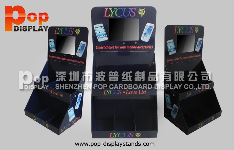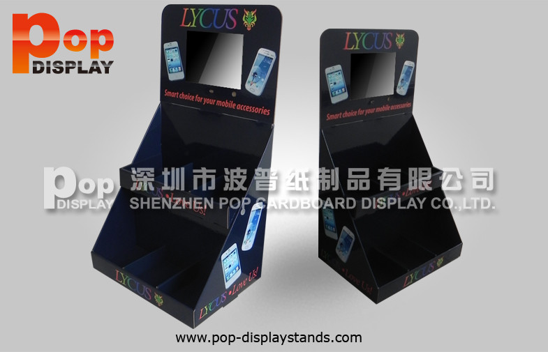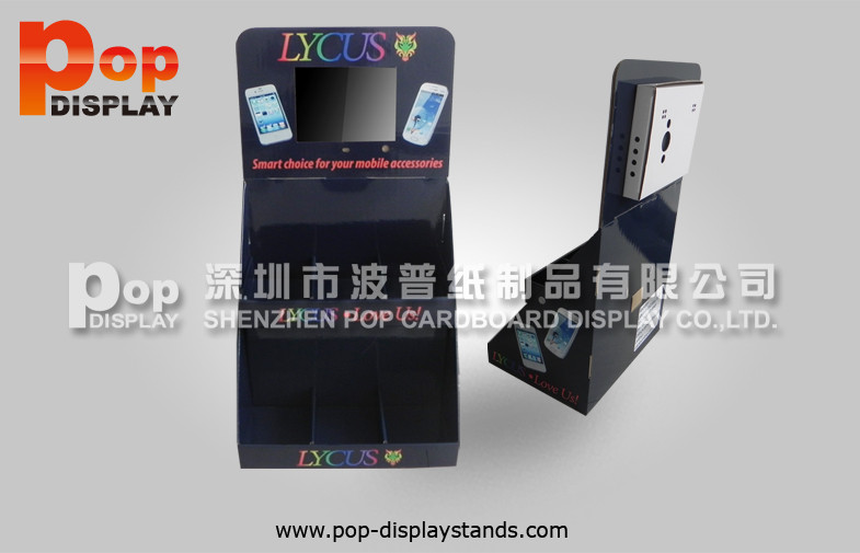 This Phone Accessories Cardboard Countertop Display Has LCD Player For Advertising, easy to carry and assemble.